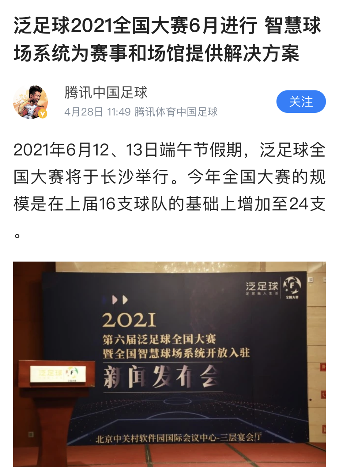 泛足球感谢媒体朋友的报道 栏目:泛足球 2021年4月27日第六届泛足球全国大赛暨全国智慧球场系统开放入驻新闻发布会圆满结束,人民日报社、BTV冬奥纪实、体坛周报、腾讯体育、ECO氪体、体育大生意、维宁体育等多家媒体对此次新闻发布会进行了报道。在此,泛足球真诚感谢媒体朋友们的关注与支持。人民日报社BTV冬奥纪实体坛周报腾 讯 体 育 ECO氪体体育大生意维宁体育再次感谢各位媒体朋友对泛足球的支持!泛足球定不负诸位期望,坚持以“足球融入生活”为使命,推动中国足球事业发展。
